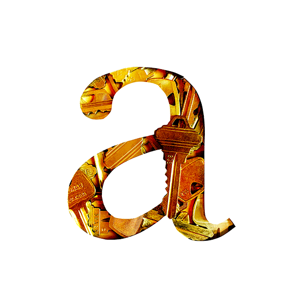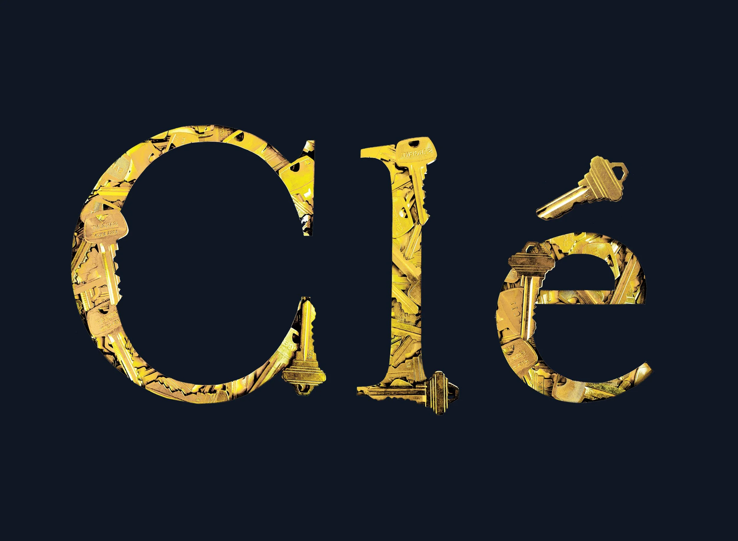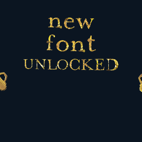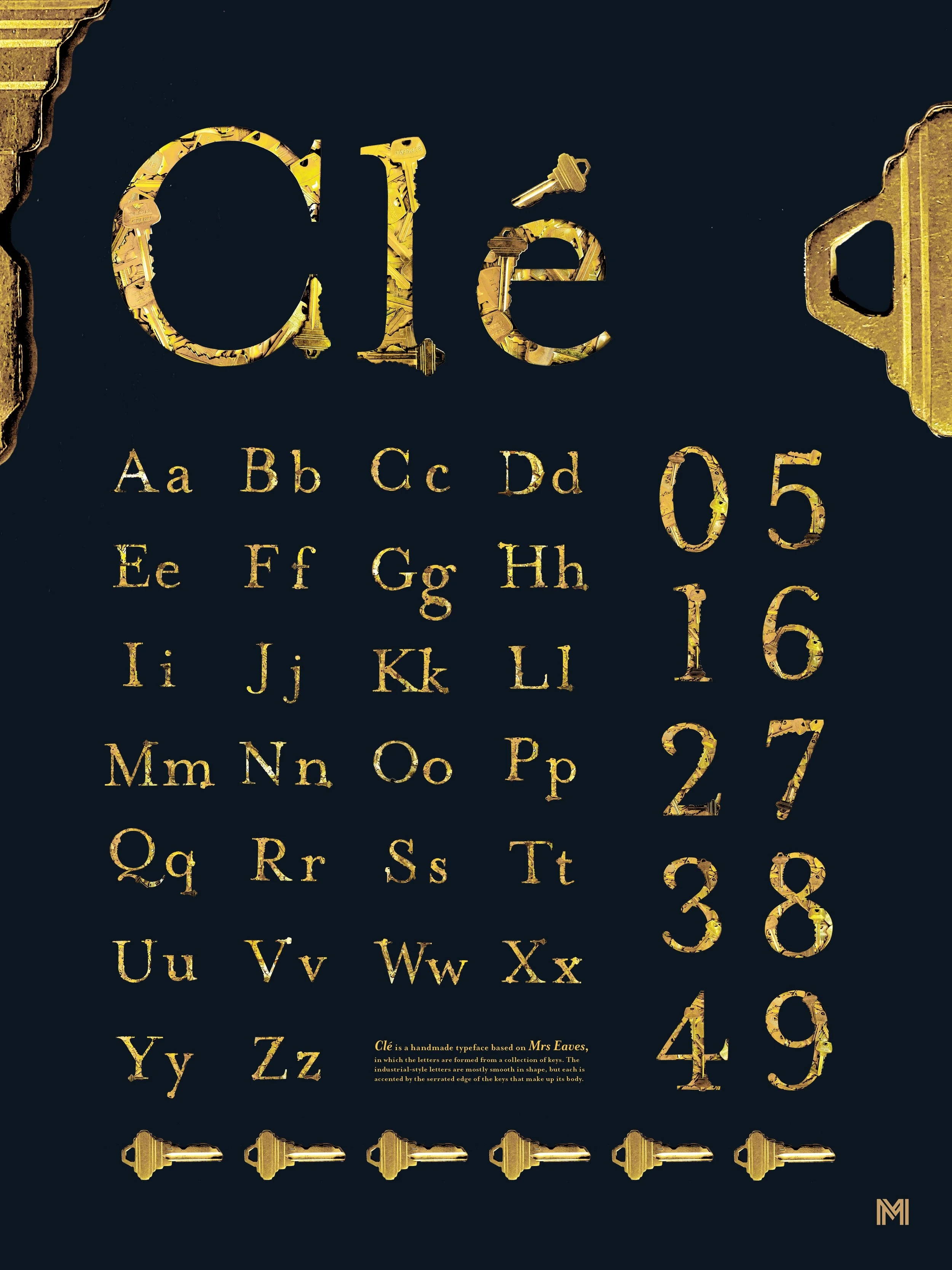 Clé is a handmade typeface made with the font Mrs Eaves and a collection of keys. It is an industrial, crisp font with smooth edges accented by the serrated keys that break the letterforms. The bright gold font works best on dark backgrounds, which truly let it shine.